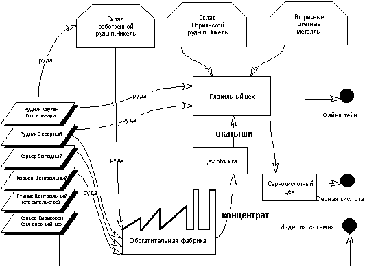 3.1. АО “ГМК Печенганикель” Общие сведения о предприятии АО “ГМК Печенганикель” расположен в северо-западной части Кольского полуострова у границы с Норвегией на двух промплощадках: в г. Заполярном и п. Никель. В состав комбината входят 2 подземных рудника, 2 карьера, обогатительная фабрика, цех обжига, плавильный и сернокислотный цеха, автотранспортный, железнодорожный и другие цеха обеспечения производства. Комбинат производит добычу сульфидной медно-никелевой руды, ее обогащение и металлургическую переработку до файнштейна. Технологическая схема производства показана на рис.2. Ежегодно добывается около 7.5 млн. т руды. Основу запасов составляют рядовые вкрапленные руды с содержанием никеля 0.5-0.6 % (95 % всех запасов). На долю богатых руд приходится 5 % запасов руд (12.4 % запасов металла).