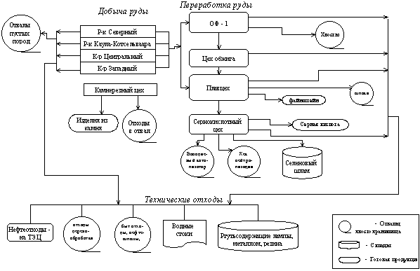 ![]() Рис. 2. Технологическая схема АО “ГМК Печенганикель” Руда с низким содержанием металлов подвергается переработке на обогатительной фабрике, расположенной в г. Заполярном. Ежегодный объем переработки составляет около 90 % от количества добытой руды. Получаемый концентрат в объеме 450-500 тыс. т поступает в цех обжига, также расположенный в г. Заполярном. В цехе обжига при получении обожженных окатышей образуется слабоконцентрированный по диоксиду серы газ, который после очистки от пыли выбрасывается в атмосферу. Богатые руды направляются в плавильный цех, расположенный в п. Никель. Туда же поступают обожженные окатыши и руда Норильского ГМК. Конечным продуктом плавцеха является файнштейн, направляемый на дальнейшую переработку в АО “Североникель”.План размещения основных цехов предприятия, включая отвалы и хвостохранилище, представлен на рис. 3. Качественная характеристика отходов Производство связано с образованием большого количества отходов: вскрышных пород, хвостов ОФ, отвального гранулированного шлака, которые оказывают отрицательное воздействие на окружающую среду (табл. 1). Блок-схема образования отходов показана на рис. 4. Для складирования промышленных отходов отведено более 9800 га. В настоящее время на прилегающих территориях накоплено и размещено вскрышных пород 1.2 млрд.т, хвостов обогащения - 200 млн.т, отвальных шлаков - 42 млн.т. Основными загрязнителями атмосферы являются металлосодержащая пыль и сернистый ангидрид. В атмосферу г. Заполярный поступает около 70 тыс.т диоксида серы (цех обжига, ТЭЦ и др.), п. Никель - свыше 170 тыс.т SO2. С металлосодержащей пылью в атмосферу выбрасывается в год никеля - 300 т, меди - 175 т, кобальта - 11 т. В природные водоемы поступает 33 млн.м3 производственных и бытовых сточных вод.