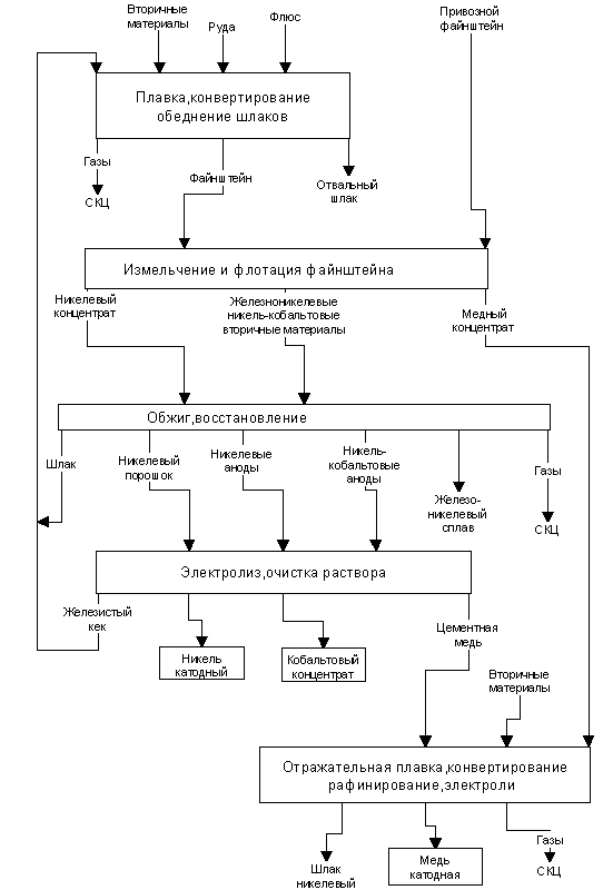 ![]() Рис.6. Существующая технологическая схема производства меди, никеля и кобальта на АО “Комбинат Североникель”