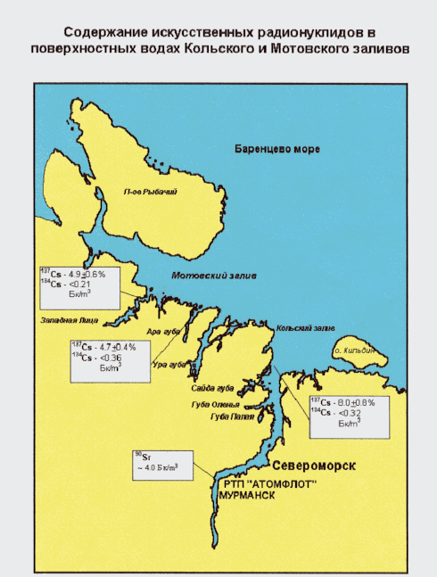 В губах Кольского залива плотность антропогенных радиоактивных осадков закономерно возрастает в расположении баз атомного флота. В Сайда губе, примерно в 2-3 км от места отстоя реакторных отсеков утилизированных подводных лодок, донные отложения содержат цезий-137 и кобальт-60 на уровне от 3-14 до 34 Бк/кг и от 7-5.0 и до 12 Бк/кг соответственно. В морских осадках имеется также плутоний-239, 240 на уровне 1.6 Бк/кг. В губе Оленья, на расстоянии 800 м от судоремонтного завода "Нерпа", концентрация цезия-137, кобальта-60 и плутония-239, 240 составляет 2-14, 1-12 и 1,6 Бк/кг. Сравнительно много кобальта-60 (до 22-24 Бк/кг), плутония-239, 240 (2.2 Бк/кг) и цезия-137 (до 15-22 Бк/кг) в донных отложениях губ Пала и Екатерининская в районе г.Полярный.