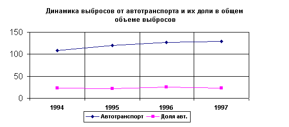 В целом по области выбросы от автотранспорта увеличились по сравнению с 1996 годом на 1.71 тыс.т., что объясняется увеличением количества автомобилей.