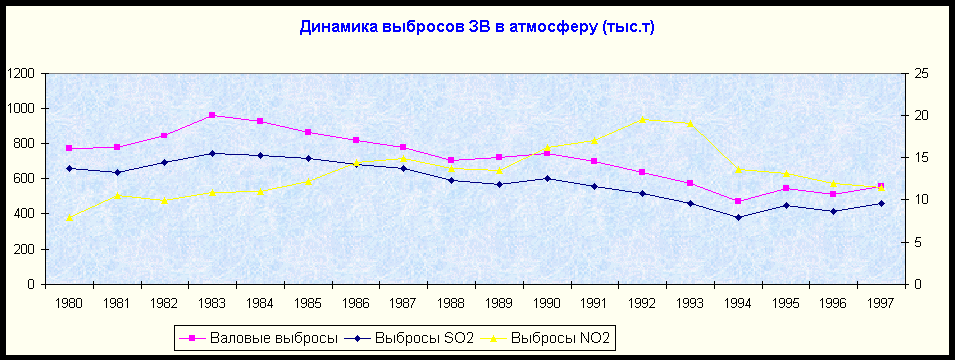 Приведем данные по валовому выбросу загрязняющих веществ в атмосферу Мурманской области от стационарных источников за период 1980-97 гг.