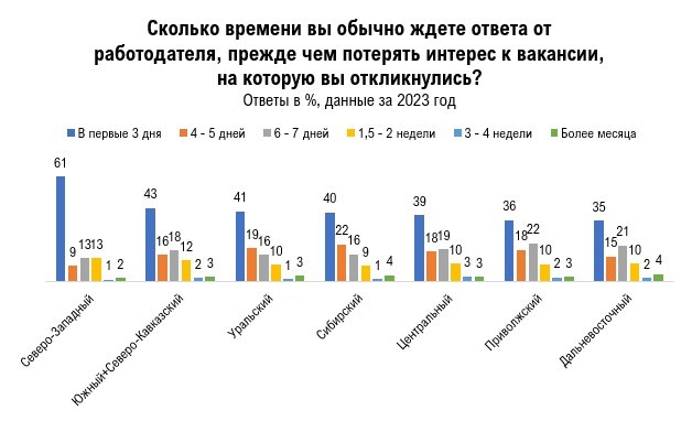 Кроме того, 2 из 3 соискателей в СЗФО заявляют, что работодатель должен ответить в течение 3 дней, чтобы оставить хорошие впечатления о компании.