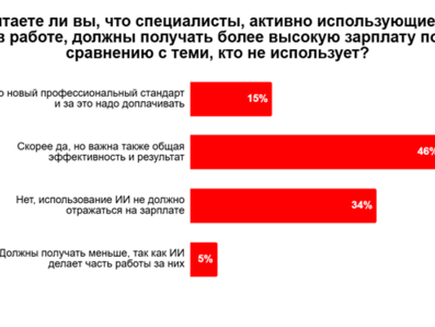 Так, 15% респондентов уверены, что работа с ИИ – это новый профессиональный стандарт, за который нужно доплачивать. Еще 46% считают, что такой навык важен, но ключевое значение все равно имеет общая эффективность специалиста. Треть (34%) полагают, что использование ИИ не должно отражаться на зарплате, а 5% – что наоборот, такие сотрудники должны получать даже меньше, ведь часть задач выполняет нейросеть.