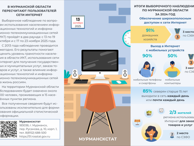 Интервьюеры в обязательном порядке должны предъявлять удостоверение Федеральной службы государственной статистики, действительное при наличии паспорта. Более подробную информацию о наблюдении можно получить по телефонам: 8 (8152) 688-615, 688-578. Мурманскстат гарантирует конфиденциальность полученных от населения сведений и использование