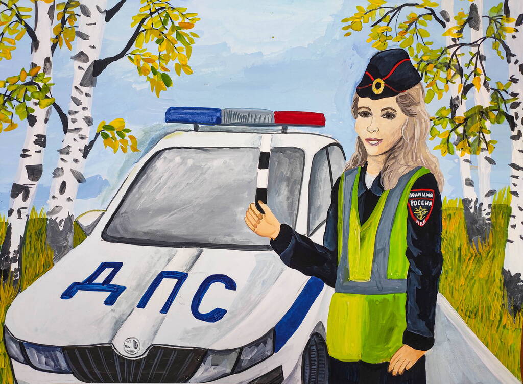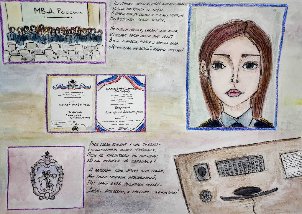 Майя Егорова с работой «Женщины в полиции». Особенностью этой работы стало то, что мама Майи – капитан внутренней службы Екатерина Егорова, заместитель начальника отдела – начальник отделения ОСУ ОСО ИЦ УМВД России по Мурманской области, дополнила художественный образ дочери проникновенным стихотворением собственного сочинения о женщинах, служащих в органах внутренних дел.