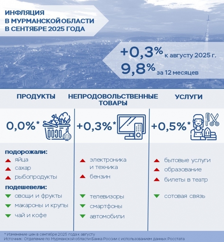 Цены в Мурманской области в сентябре 2025 года, по данным Росстата, выросли на 0,25% к августу, что меньше, чем в целом по стране (0,34%). Годовая инфляция при этом осталась выше и составила 9,8%.