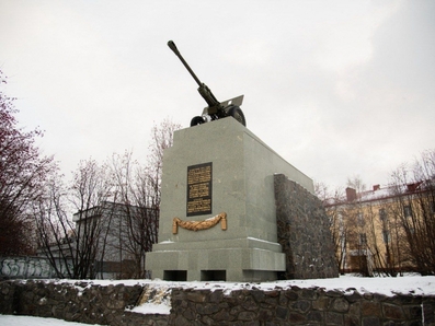 66 лет назад, 6 ноября 1959 года в Мурманске был открыт памятник самоотверженным защитникам города. Автором проекта стал выдающийся архитектор Дмитрий Водолажский, в качестве главного элемента мемориала было использовано 76-мм дивизионное орудие ЗИС-3. В 1965 г. у памятника был зажжен Вечный огонь, в 1975 г. перенесённый к мемориалу Защитникам Советского Заполярья на Зелёном мысе. В 1991 г. у подножия монумента были захоронены останки бойцов батареи, перенесенные с места боя, спустя три года установлена плита с именами погибших артиллеристов.