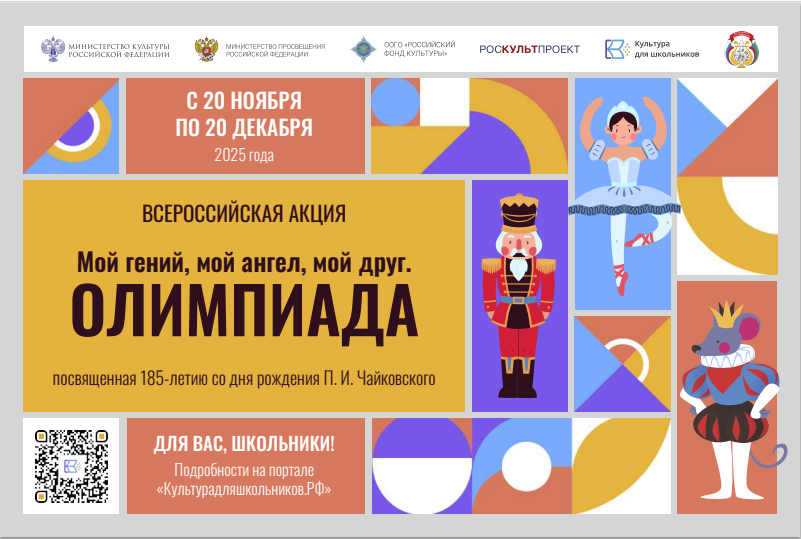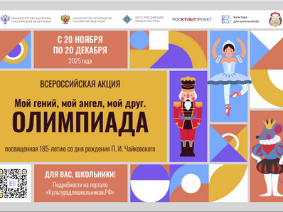 В рамках межведомственного культурно-образовательного проекта «Культура для школьников» с 20 ноября по 20 декабря 2025 года пройдет всероссийская акция «Мой гений, мой ангел, мой друг. Олимпиада», посвященная 185-летию со дня рождения П. И. Чайковского.