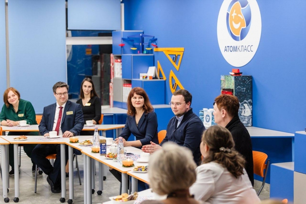 Гостю был продемонстрирован кабинет-трансформер со сдвижной перегородкой и магнитными стенами. Затем за чашкой чая состоялся разговор с учителями, преподающими в Атомклассе.