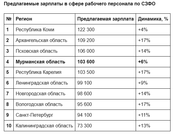 Уровень заработных плат в Мурманской области не является максимальным. В 2025 году медианная предлагаемая зарплата для рабочих в регионе составила 103,6 тыс. рублей. Более высокие доходы предлагают субъекты с более сложными условиями труда, например Республика Коми (122,3 тыс. рублей), Архангельская область (109,2 тыс. рублей) и Псковская область (106 тыс. рублей).
