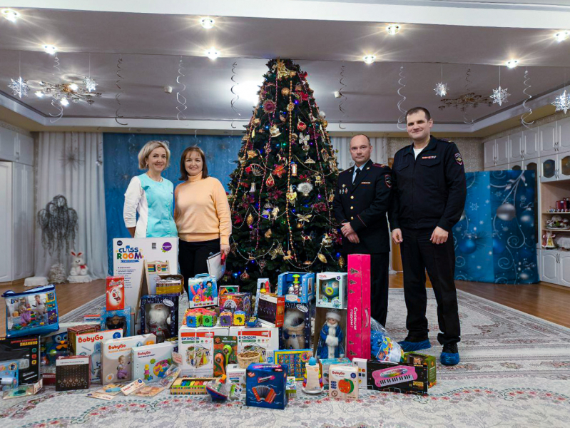 Стражи порядка привезли целый комплект тщательно подобранных подарков, направленных на развитие и радость: яркие развивающие конструкторы, куклы, игрушечные машинки, в том числе с полицейской символикой, головоломки, настольные игры, мягкие игрушки и многое другое. Все презенты были размещены под нарядной новогодней ёлкой, создав настоящую атмосферу волшебства, чтобы каждый ребенок смог найти свой особенный сюрприз от «Полицейского Деда Мороза».