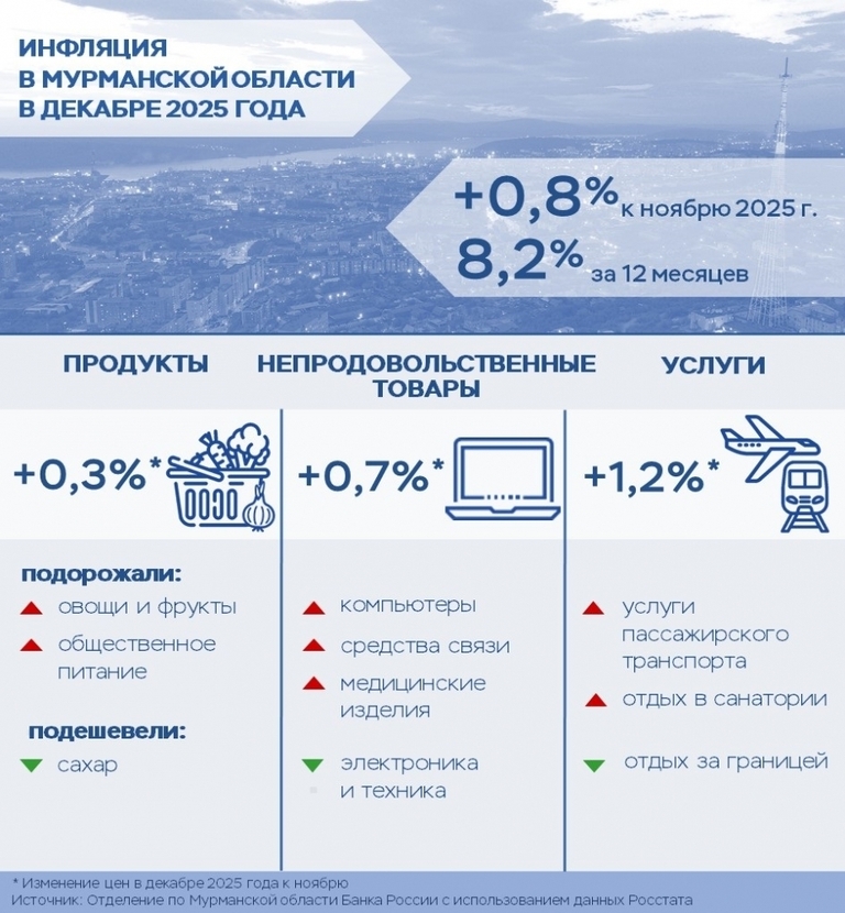 По данным Росстата, цены в Мурманской области в декабре 2025 года по сравнению с ноябрем выросли на 0,8%. При этом годовая инфляция продолжила замедляться и составила 8,2%.