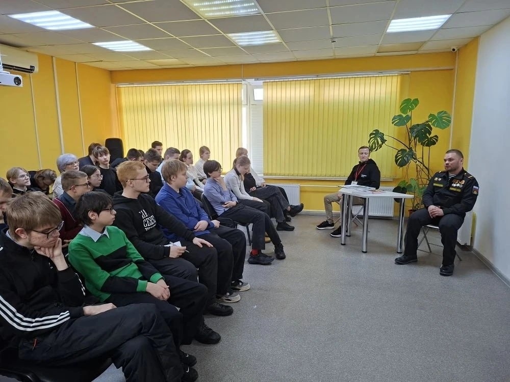 Гостями и главными героями урока стали координатор государственного фонда «Защитники Отечества» Виктор Гуйчук и участник специальной военной операции, морской пехотинец Северного флота Виталий Парасич.