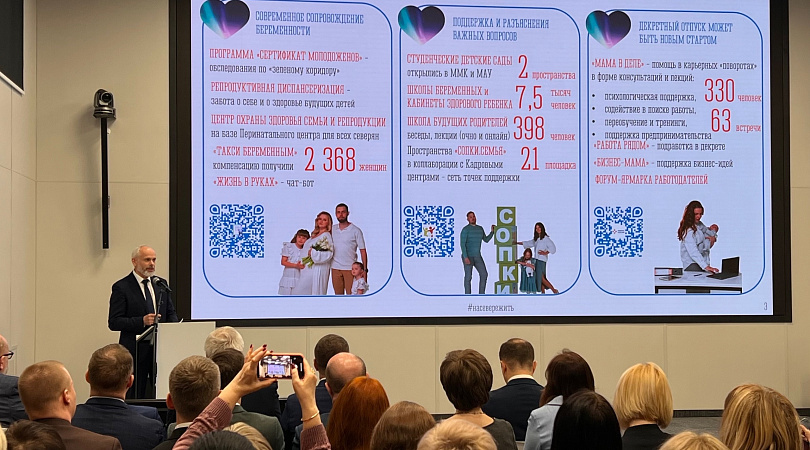 В направлении демографии в регионе сейчас действует 30 мер поддержки семей с детьми. С 1 апреля стартовал губернаторский проект «На Севере – малыш». Продолжается репродуктивная диспансеризация, компенсацией проезда «Такси для беременных» воспользовались 2 368 женщин. Для студенческих семей оборудованы комнаты кратковременного пребывания детей в МАУ и Медицинском колледже. На площадках «СОПКИ.СЕМЬЯ» работают «Школа беременных» и «Мама в ритме счастья». В кадровых центрах с августа 2025 года проводятся тематические четверги «Семейное право и социальная защита». Проект «Мама в деле» охватил 330 женщин. В программе «Работа рядом» с мая 2025 года могут участвовать женщины в отпуске по уходу за ребенком до 3 лет – трудоустроены 7 человек, а 20 женщин получили финансовую поддержку на открытие бизнеса по программе «Бизнес-мама».