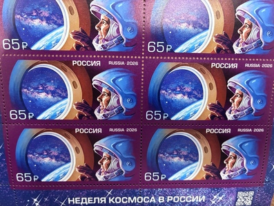 В 2026 году Неделя космоса будет посвящена 65-летию первого полёта человека в космос, который осуществил советский космонавт Юрий Гагарин. На почтовой марке изображён символичный образ космонавта, наблюдающего из иллюминатора космического корабля звёздное скопление.